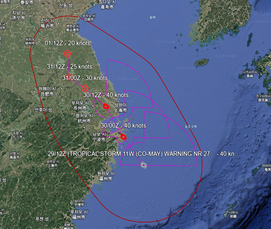 8호 태풍 꼬마이는 7.29. 21시 현재 중국 상하이 푸동 국제공항에서 남남서쪽으로 약 320km가량 떨어진 해상인 28.6°N 123.4°E 인근 지점에서 상하이 방면을 향해 시속 약 15km의 속도로 북서진(8노트 310Deg)하고 있습니다.