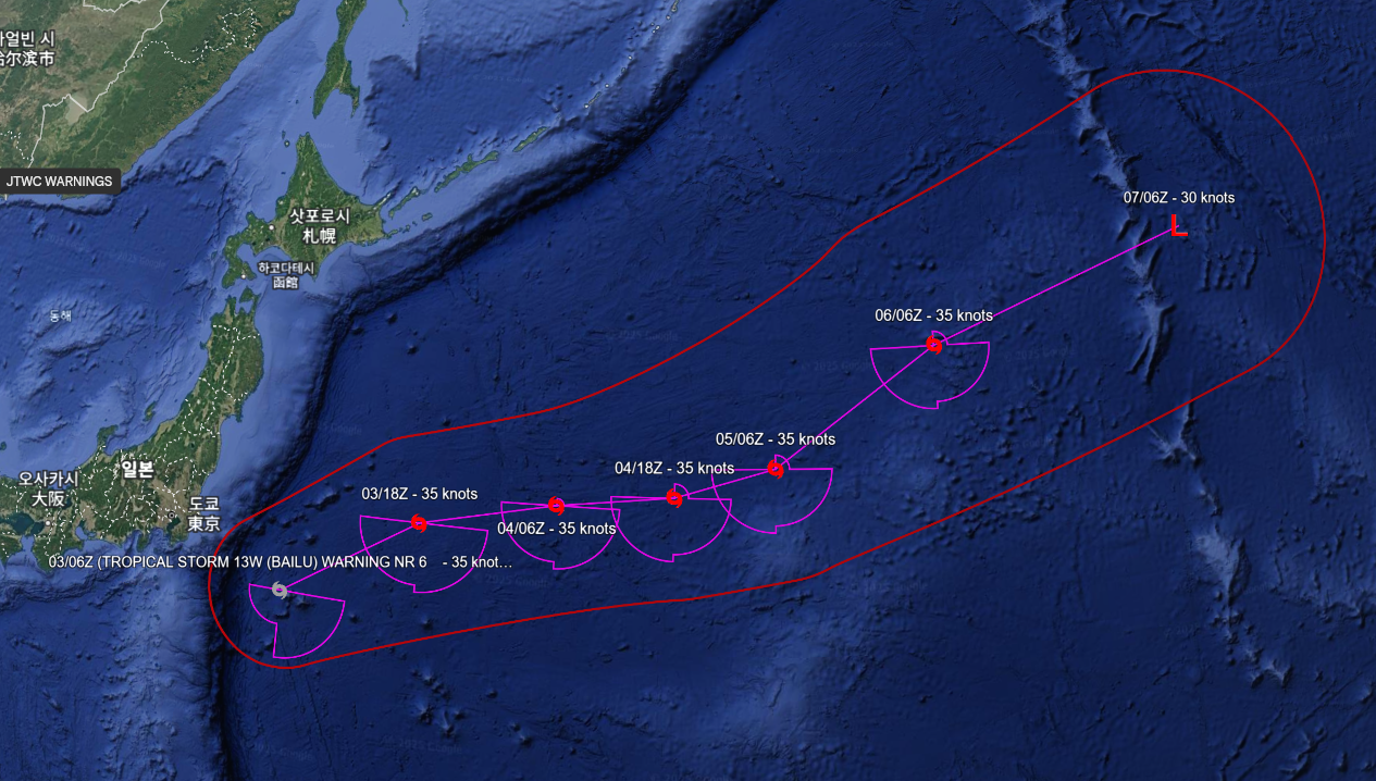 현재 10호 태풍 바이루의 위치는 일본 도쿄 하네다 국제공항에서 동남동쪽으로 약 370km가량 떨어진 해상인 34.4°N 143.6°E 인근 지점이며, 중심기압 998hPa, 1분 평균 최대풍속은 시속 약 65km(35노트)의 열대폭풍(TS)에 해당하는 강도입니다.