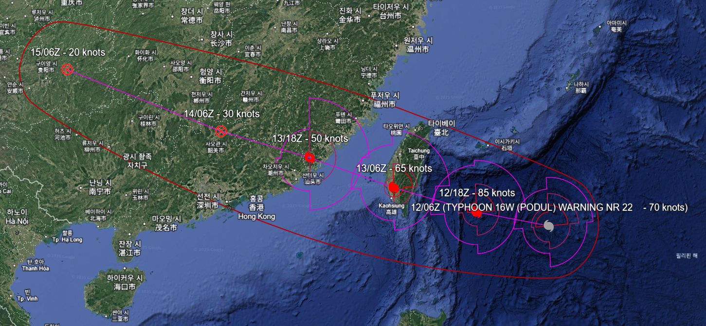 현재 JTWC의 예상은 대만 상륙 직전 태풍의 강도는 조금 더 강화되어 1분 평균 풍속이 시속 약 160km(85노트) 수준까지 강화할 것으로 보고 있으나, 일부 예측 모델에서는 이보다 10~15노트 더 높은 수준인 시속 약 175~185km의 SSHS 카데고리 2~3등급까지 발달할 가능성도 내다보고 있어 대만 남부를 중심으로 하는 지역에서는 태풍에 대한 각별한 주의가 필요하겠습니다.