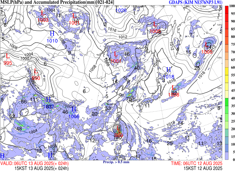 특히 지금 만주쪽에서 한랭저기압이 한반도 북쪽을 통과하면서 북태평양 고기압과 대륙쪽 극기단간의 온도차가 꽤 크게 날 것으로 보이는데 이런 상태에서 전선이 활성화될 경우 8월에서 9월 사이 발달하는 정체전선의 경험적 형태인 좁은 구역에 집중적인 폭우를 일으키는 것이 이번에도 나타날 수 있어 8.13~14. 사이 전국단위 폭우에 대한 주의도 필요하겠습니다.