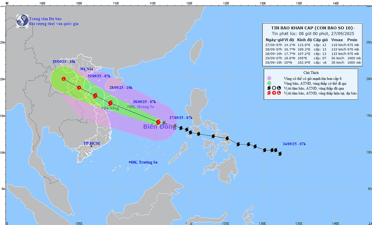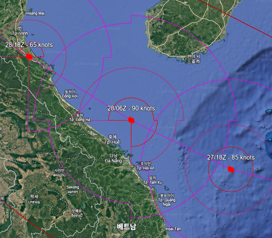 앞으로 48~60시간 범위인 9월 29일 무렵 태풍은 베트남 통킹만 남쪽 해안선인 빈(Vinh)에서 후에(Hue) 사이 해안으로 상륙할 것으로 보이며, 이 직전인 9월 28일 오전부터는 베트남 중부인 다낭 일대가 태풍의 직접영향권(17m/s이상 강풍반경 안쪽)에 들어겠으며, 28일 오후 무렵에는 일시적으로 다낭 전역이 태풍의 폭풍반경(25m/s이상 구역)에 들어오며 일시적인 항공기의 결항 또는 연착 등이 발생할 수 있으며, 해안가 저지대의 침수, 폭풍으로 인한 건물 피해 등이 발생할 수 있어 주의가 필요하겠습니다.