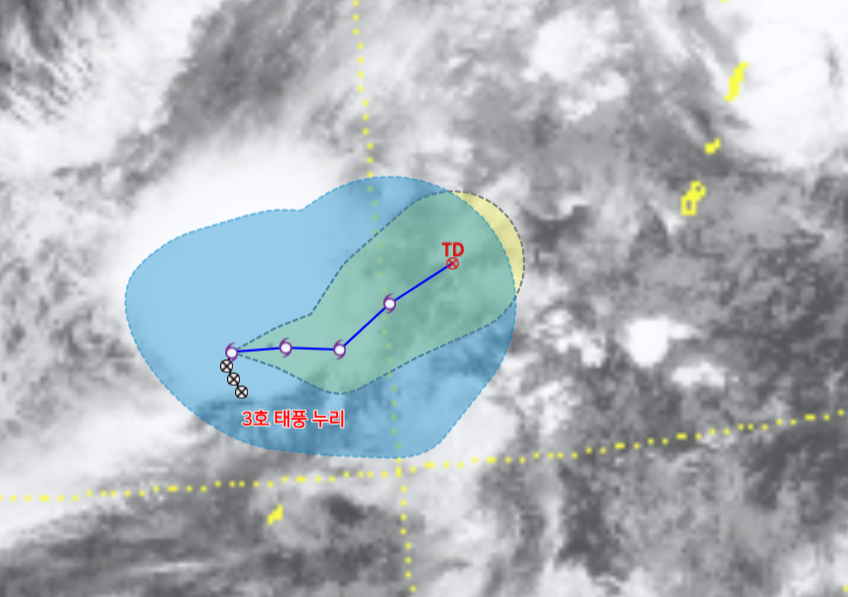 지난 주말 무렵 생성되어 계속 열대요란 추적 마크가 붙어있던 95호 열대요란(한국기상청 5호 열대저압부)이 불과 6시간만에 발달하여 3호 태풍 누리가 공식 발생하였습니다.