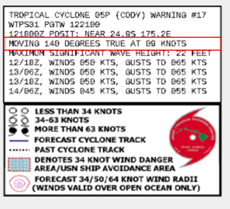 미국 태풍 합동경보센터(JTWC)의 통보문을 보면 오른쪽 위에 위쪽 그림과 같은 정보가 적혀있습니다. 일단 위의 이미지는 2021-2022년 남태평양 5호 사이클론 코디(05P-CODY)의 통보문 내용인데요